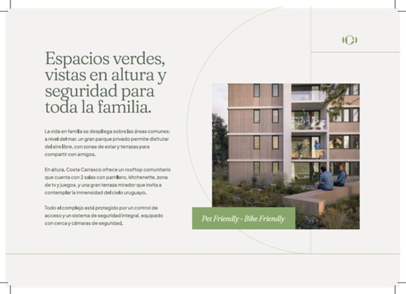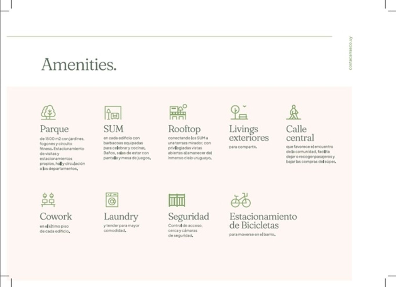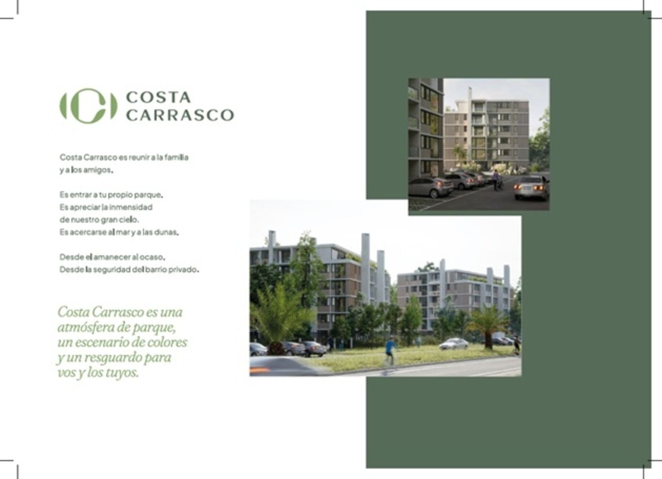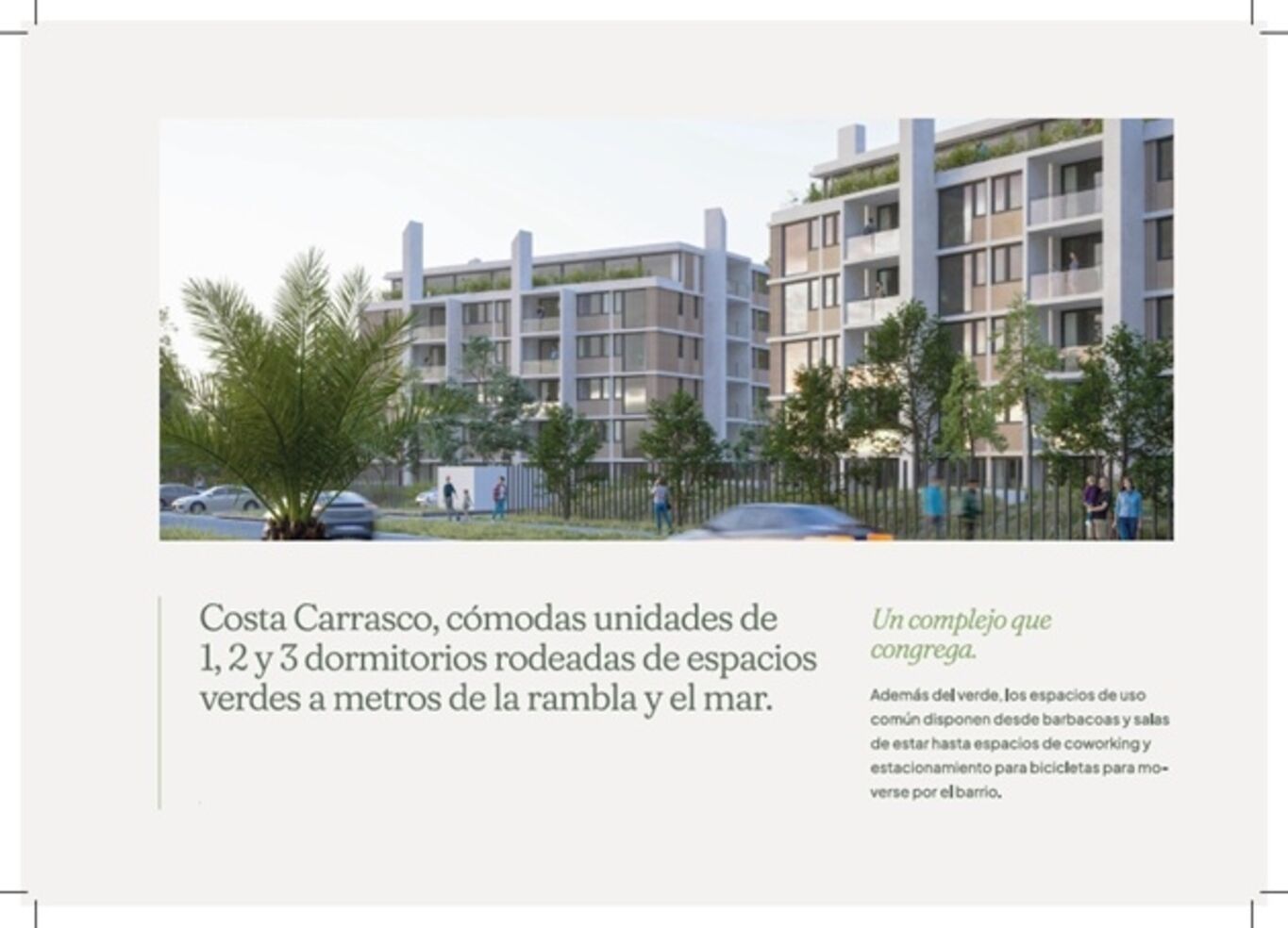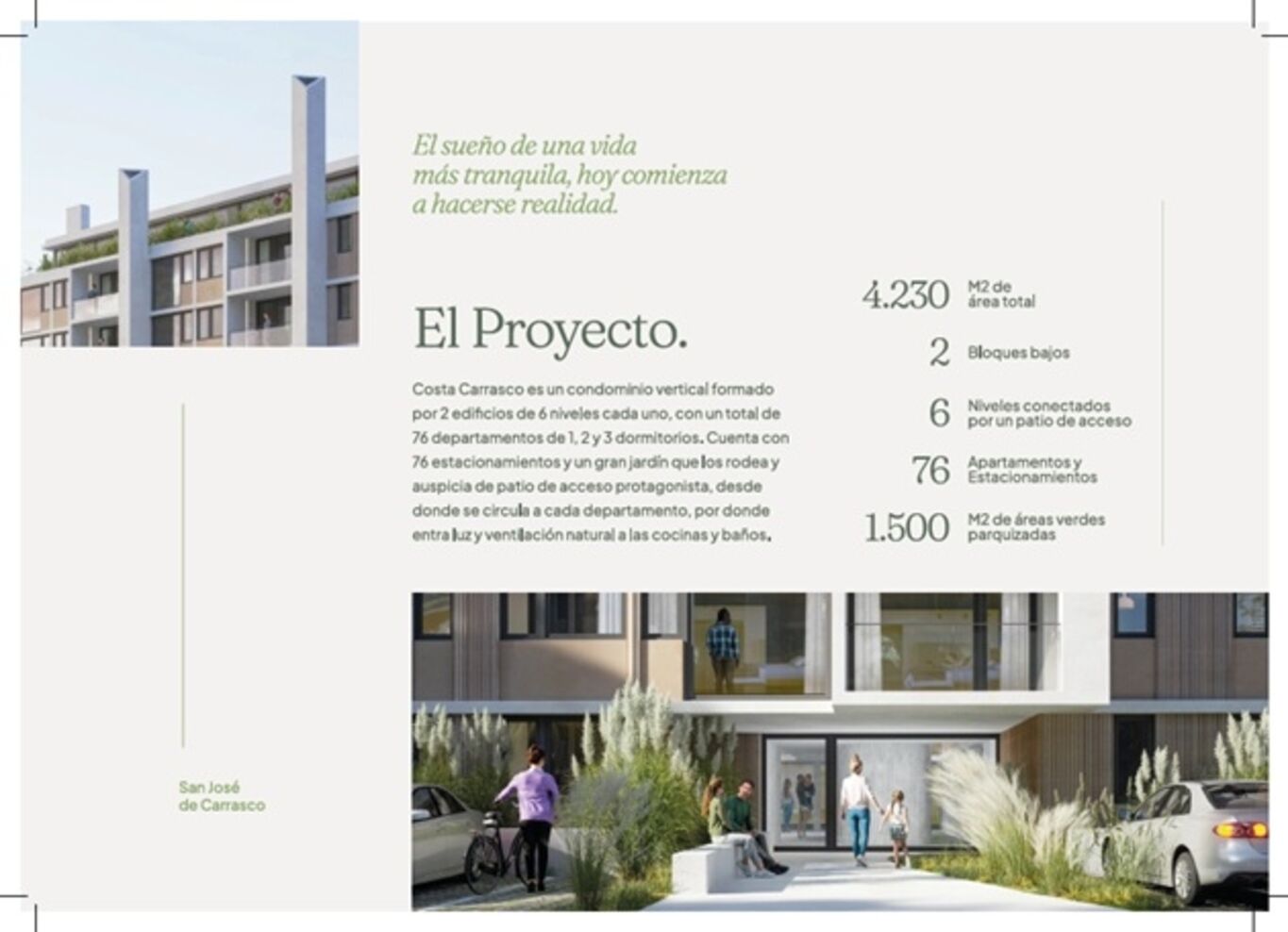 Kosak Presenta Costa CarrascoEs un condominio vertical formado por 2 edificios de 6 niveles cada uno, con un total de 76 departamentos de 1, 2 y 3 dormitorios. Cuenta con 76 estacionamientos y un gran jardín que los rodea y auspicia de patio de acceso protagonista, desde donde se circula a cada departamento, por donde entra luz y ventilación natural a las cocinas y baños.