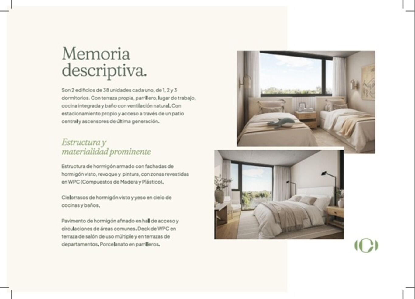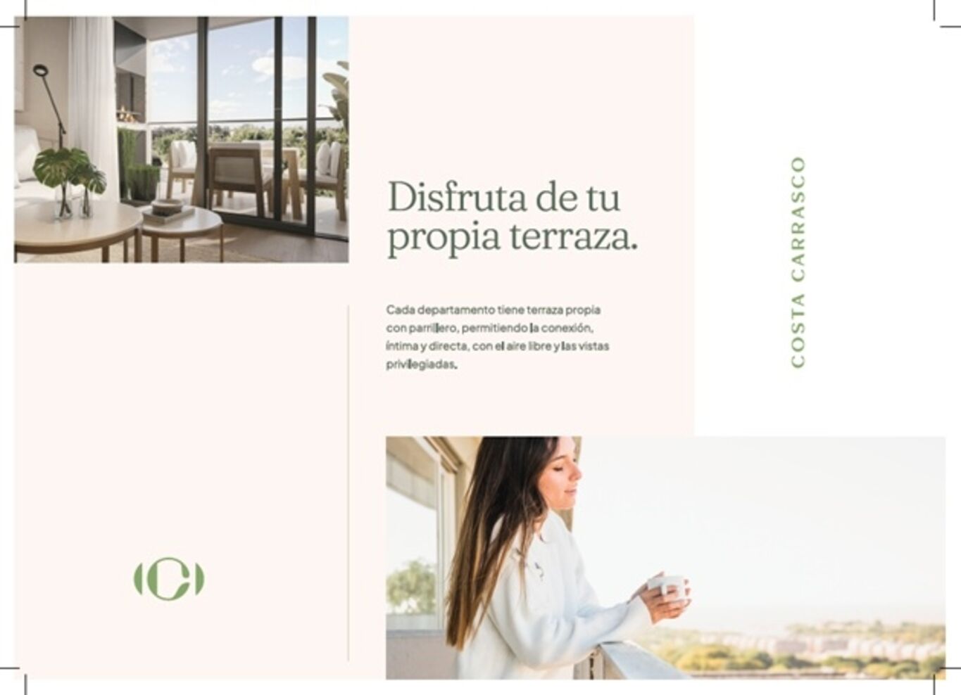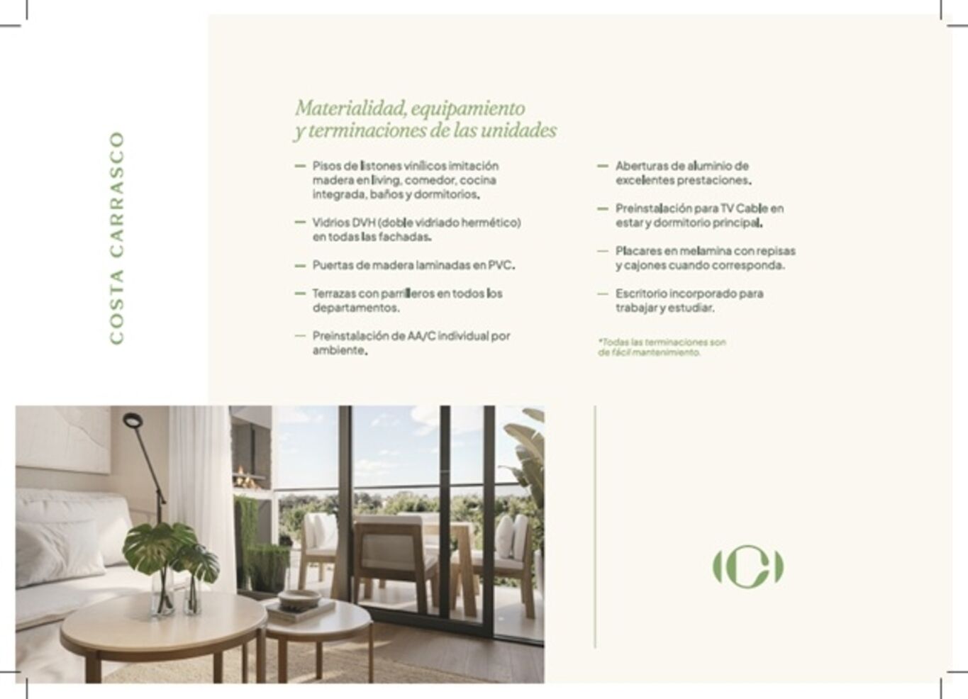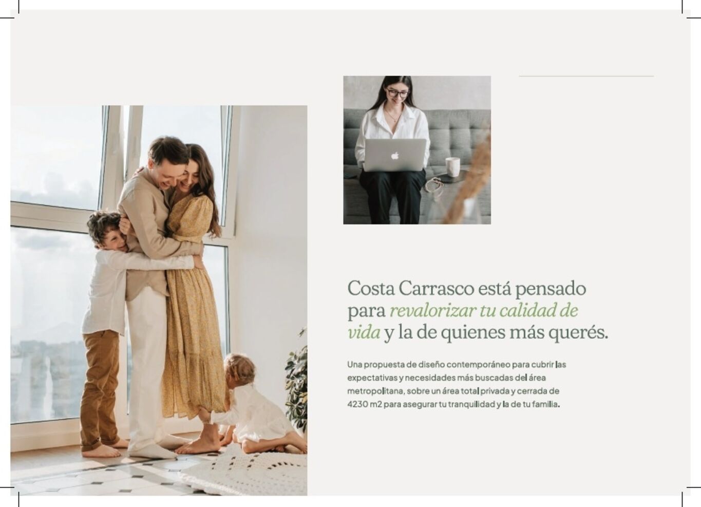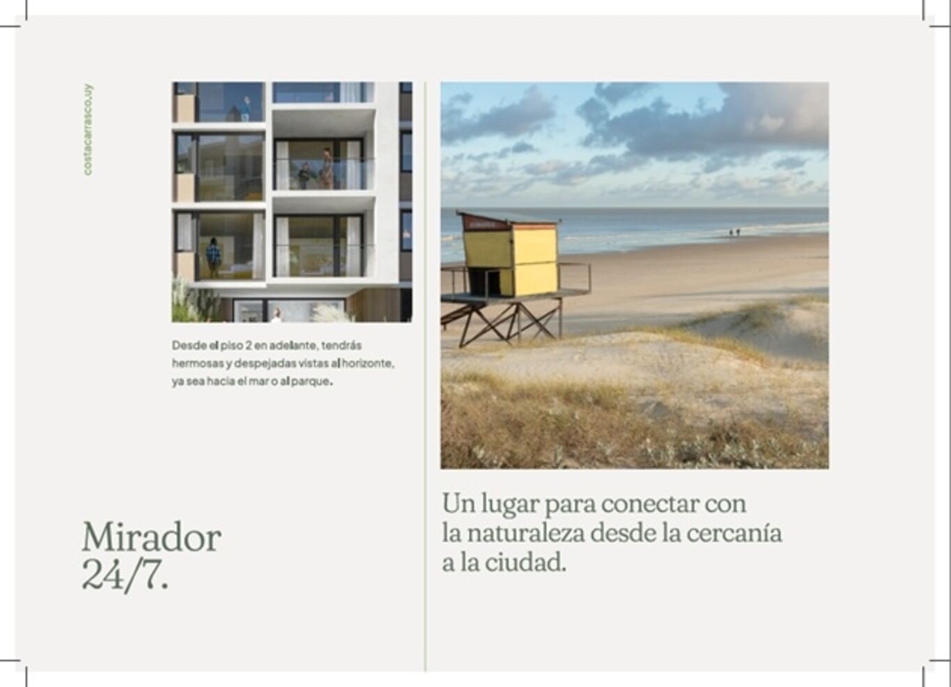 Kosak Presenta Costa CarrascoEs un condominio vertical formado por 2 edificios de 6 niveles cada uno, con un total de 76 departamentos de 1, 2 y 3 dormitorios. Cuenta con 76 estacionamientos y un gran jardín que los rodea y auspicia de patio de acceso protagonista, desde donde se circula a cada departamento, por donde entra luz y ventilación natural a las cocinas y baños.