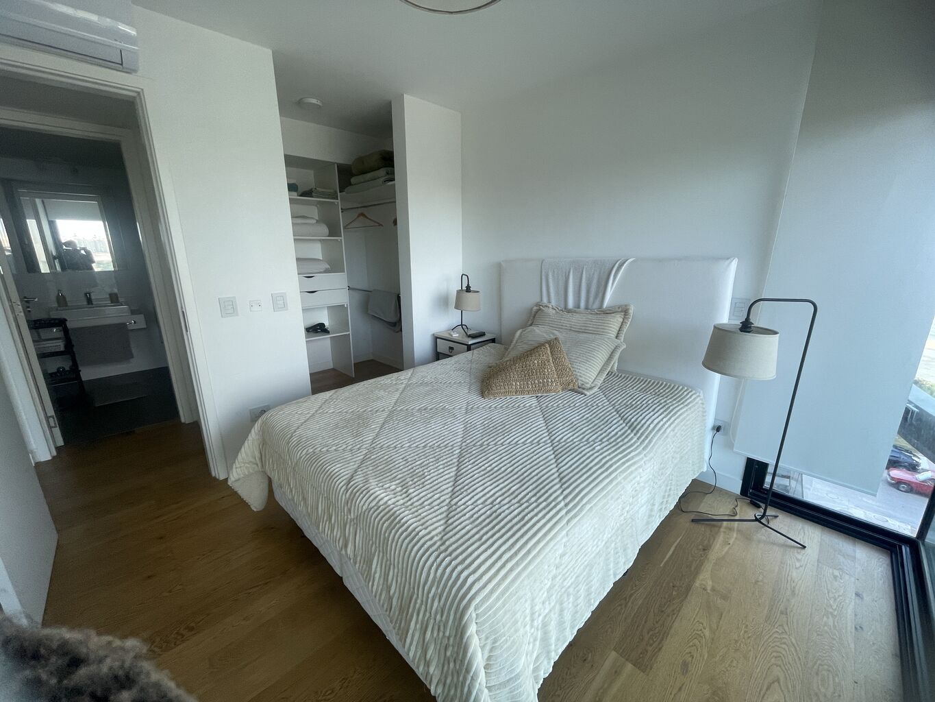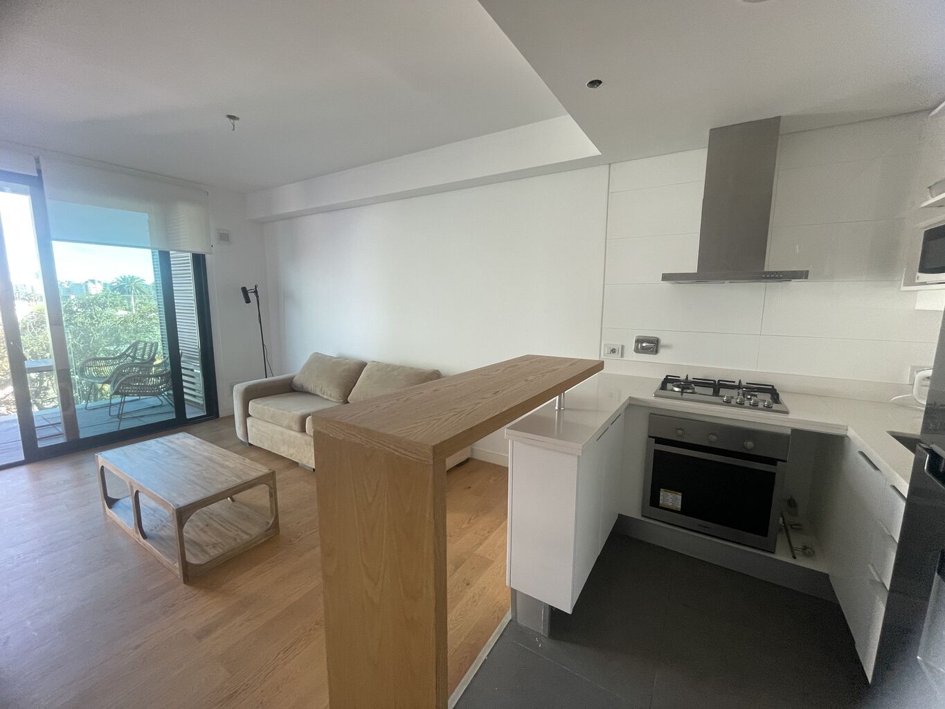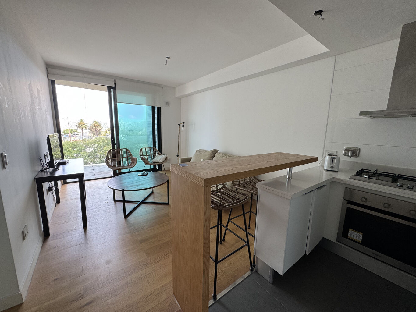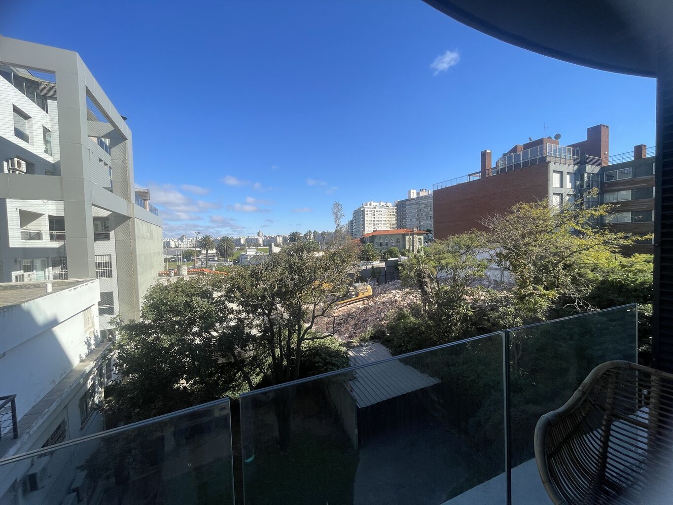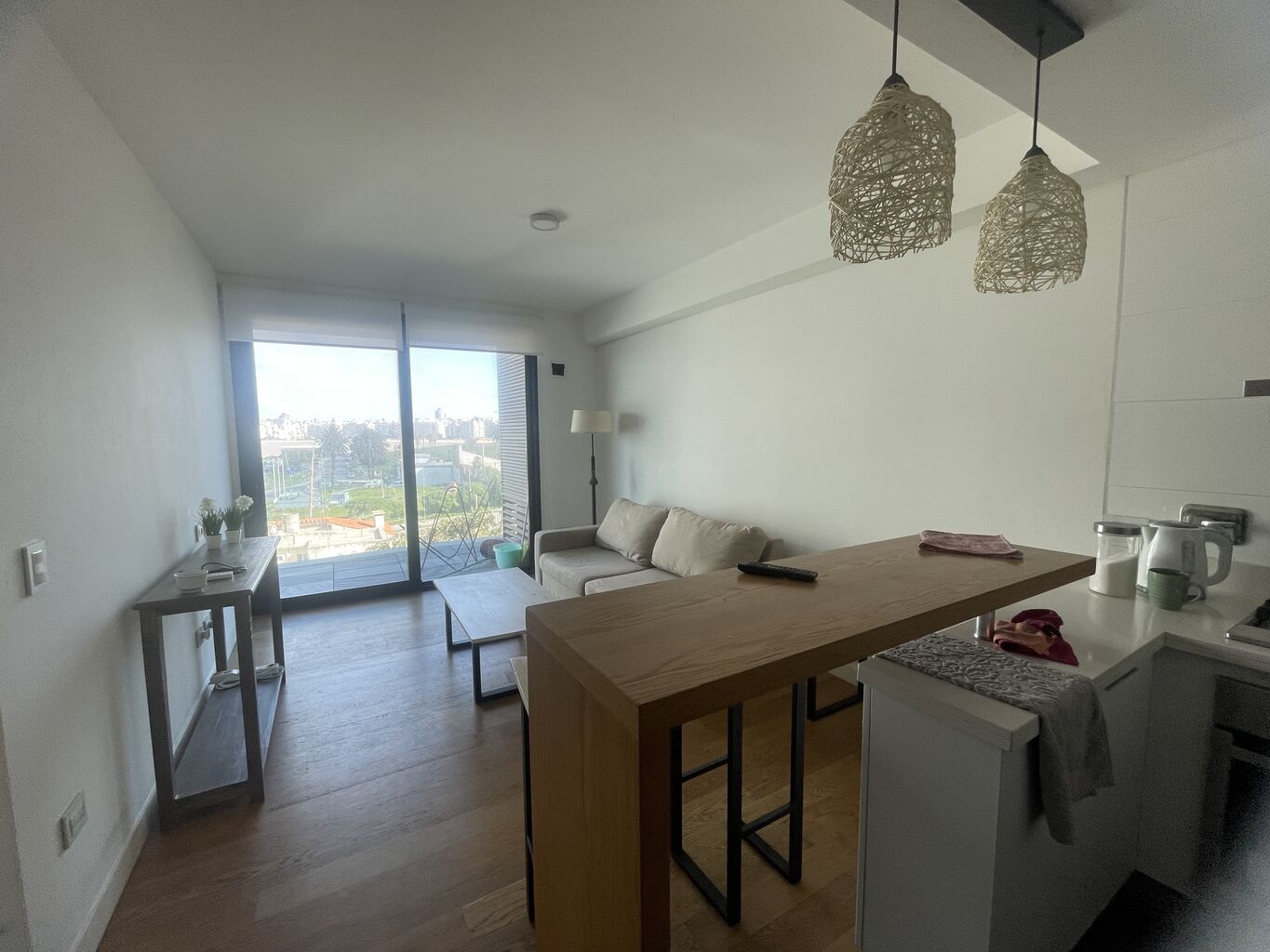 La unidad cuenta con living-comedor con salida a terraza, cocina integrada con equipamiento de alta calidad, dormitorio con placard, y baño completo. Terminaciones de primera línea, climatización por losa radiante individual y grandes ventanales que aseguran excelente luminosidad.