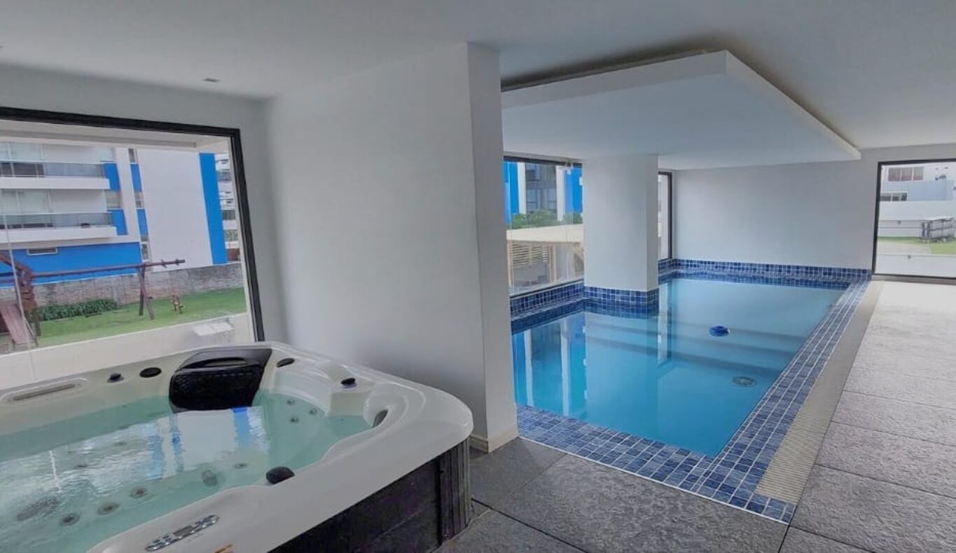 Piscina exterior e interior, Jacuzzi, sala de juegos para chicos, gimnasio, parrillero, lavanderia, recepción y estacionamiento.