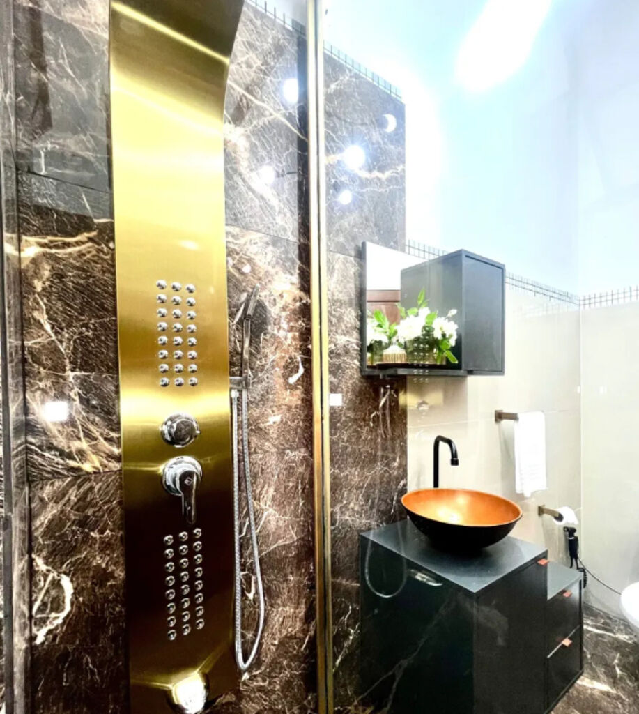 Baño espectacular, revestido en gres, equipado con ducha escocesa con terminación en bronce, mampara de vidrio templado y accesorios en símil bronce.
