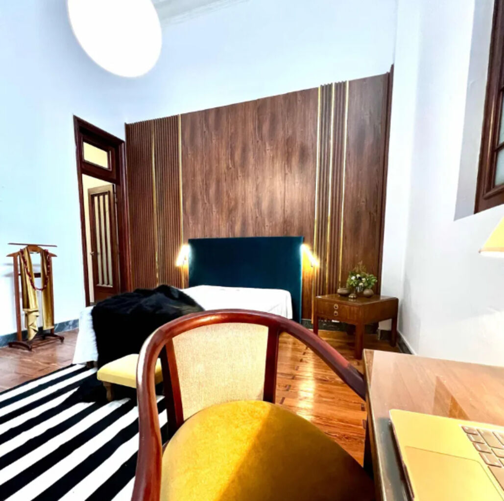 Dormitorio principal muy espacioso, con pared revestida en madera, iluminación de diseño empotrada y escritorio de estilo.