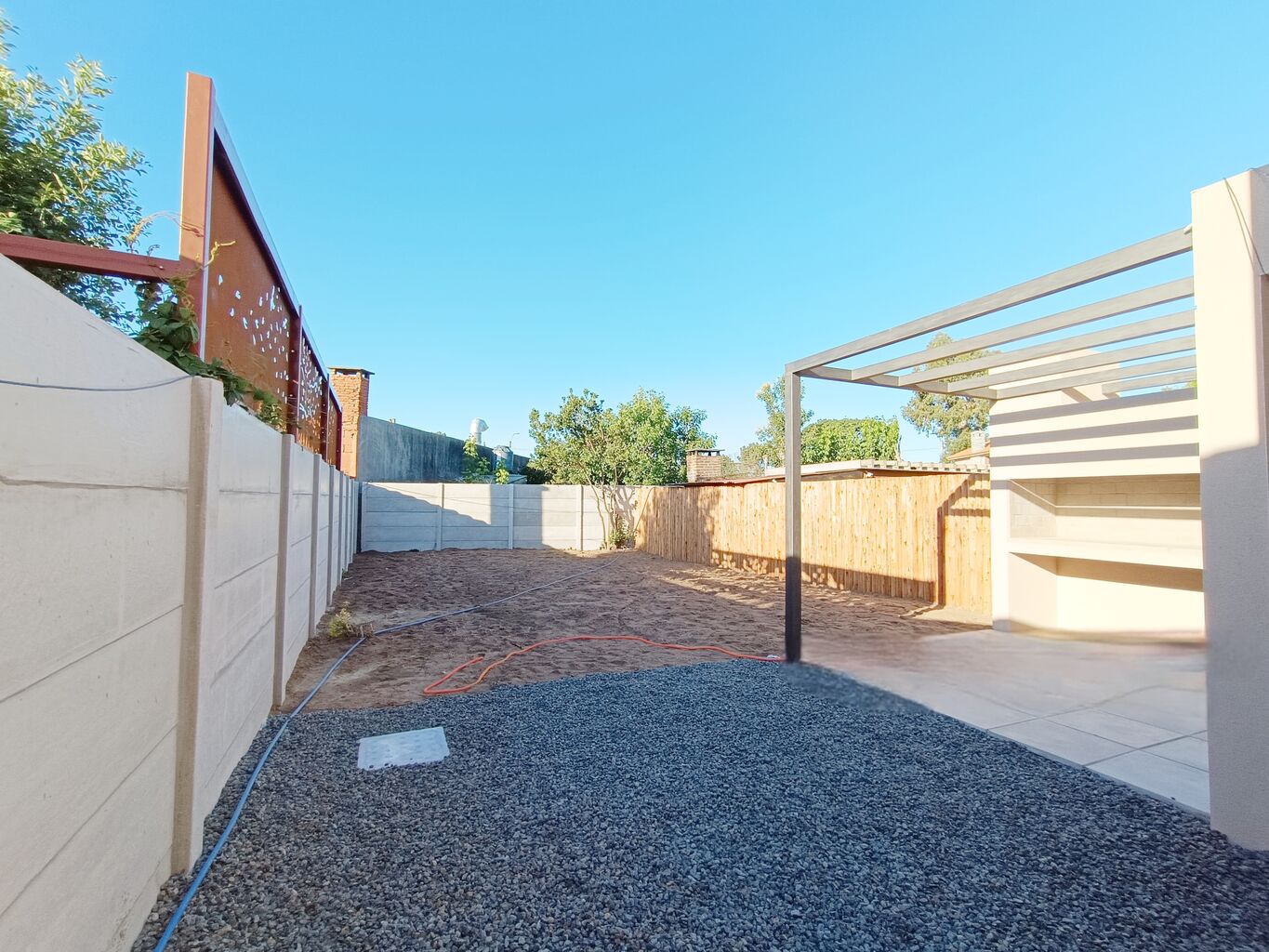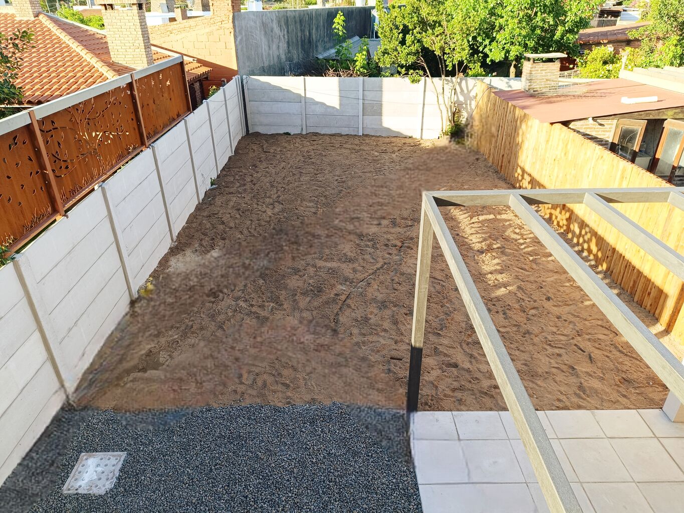 Cerramiento perimetral al frente con rejas, portón vehicular y peatonal, al fondo cerramiento perimetral con polines y muro.