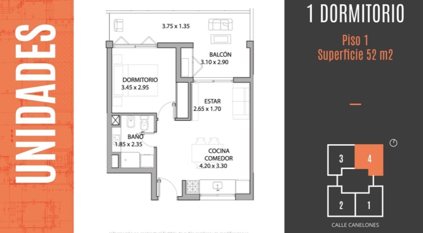 Unidad 104 consta de living-comedor con salida a amplia terraza de 12 m2, cocina vinculada, un dormitorio, baño completo