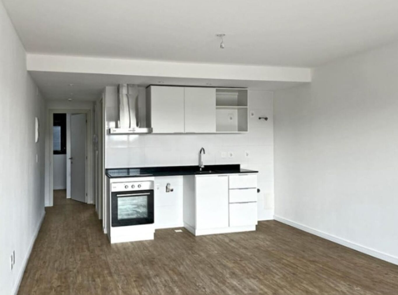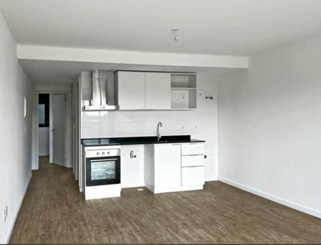 Cocina equipada con muebles aéreo y bajo mesada, anafe vitrocerámico, horno y campana de acero inoxidable.