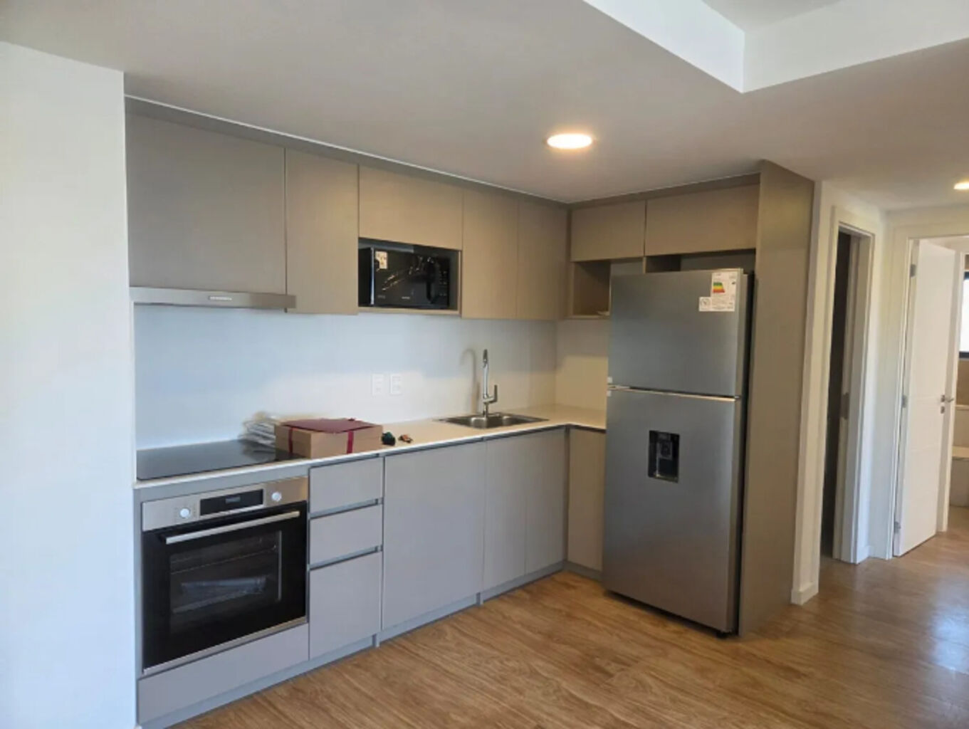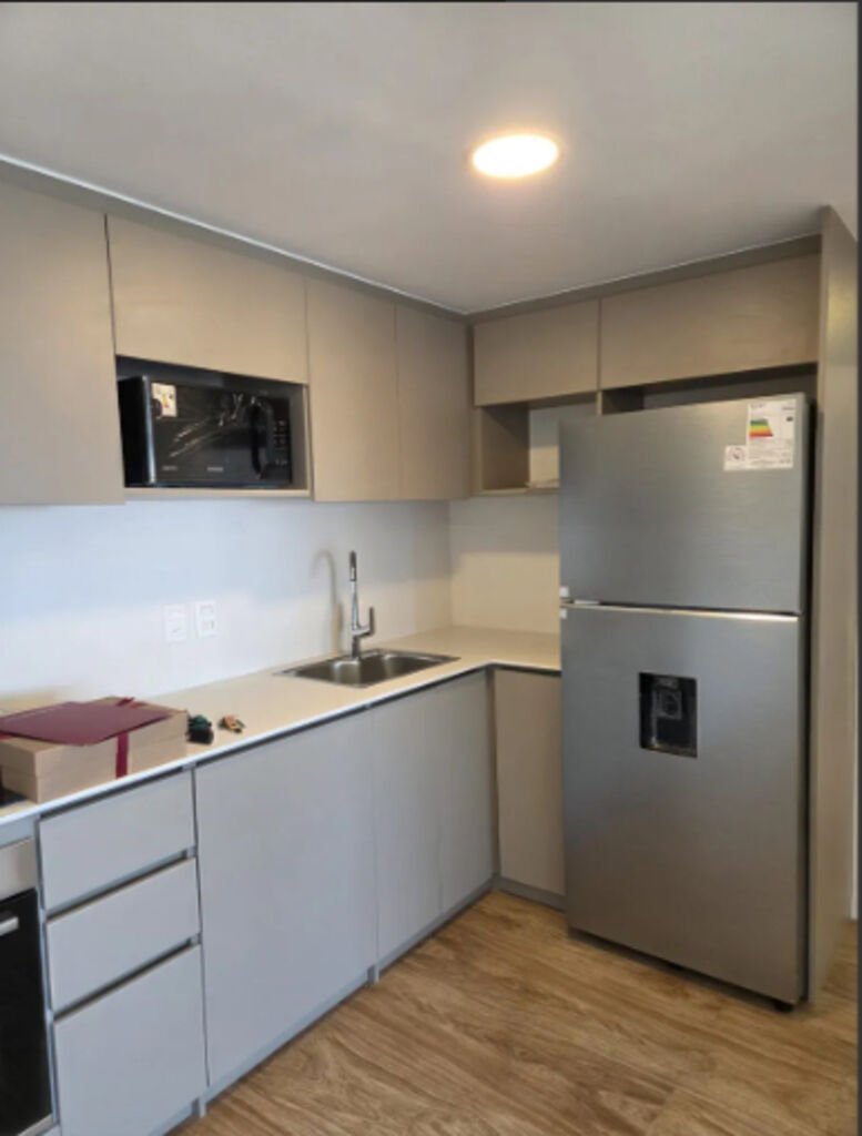 Cocina integrada con campana, anafe Bosch, horno eléctrico, microondas, heladera y calefón.