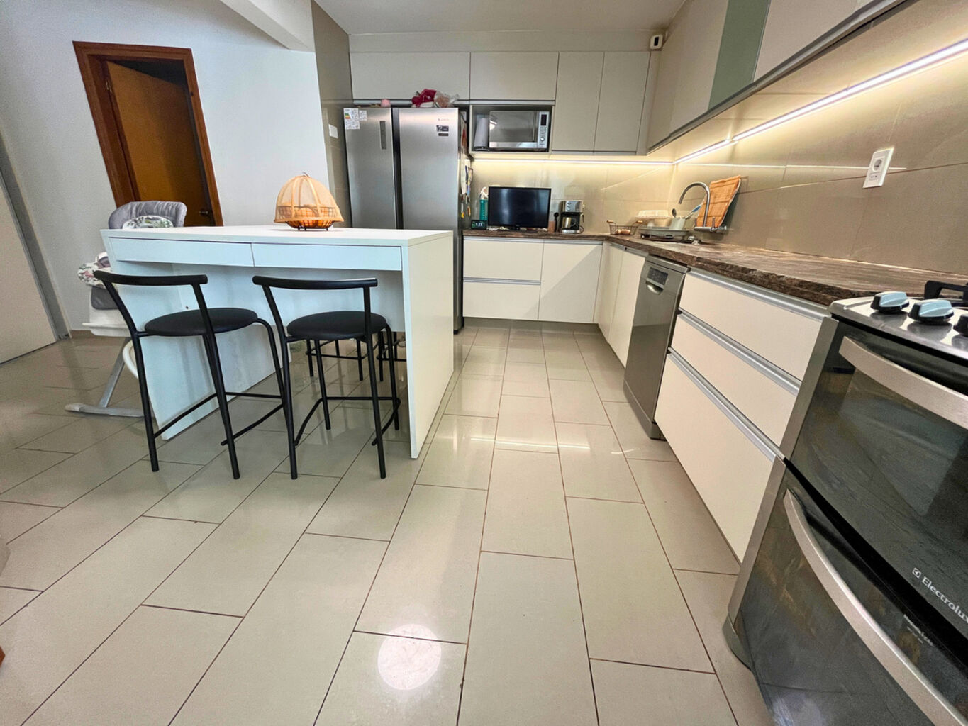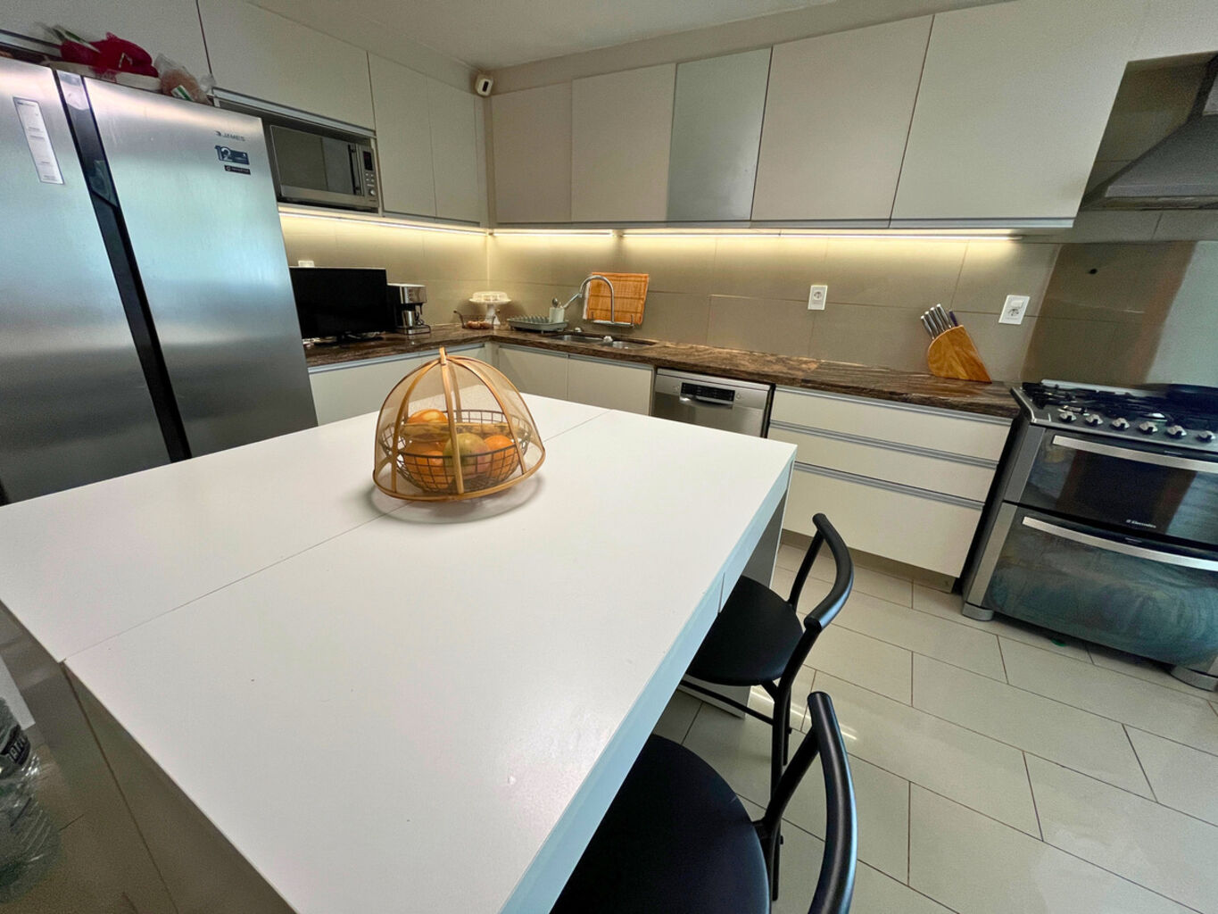 Cocina definida con isla central, alacena y espacio lavadero.