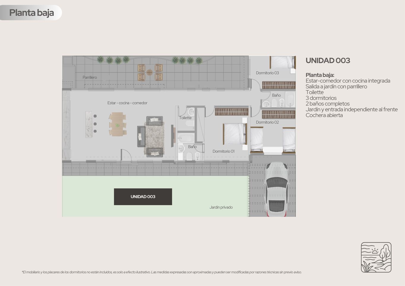La propiedad cuenta con Estar, cocina integrada con muebles bajo mesada, comedor que se integra fácilmente a la terraza con parrillero, baño social, 3 dormitorios principal en suite, 2 baños completos.