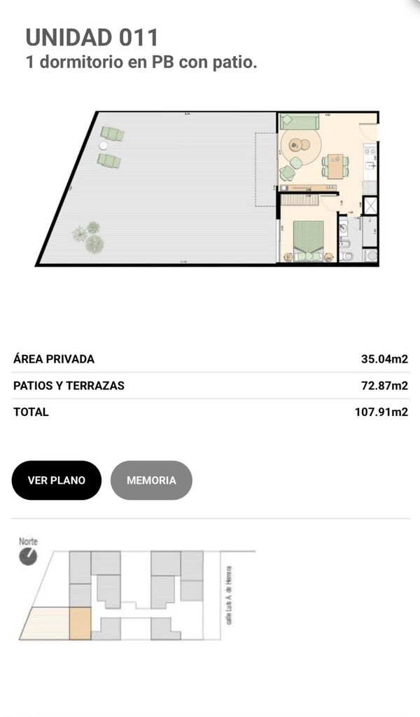 La unidad cuenta con patio de gran tamaño, cocina equipada con placares aéreos y bajo mesada, anafe, horno y campana, y dormitorio con placar. Incluye garaje.
