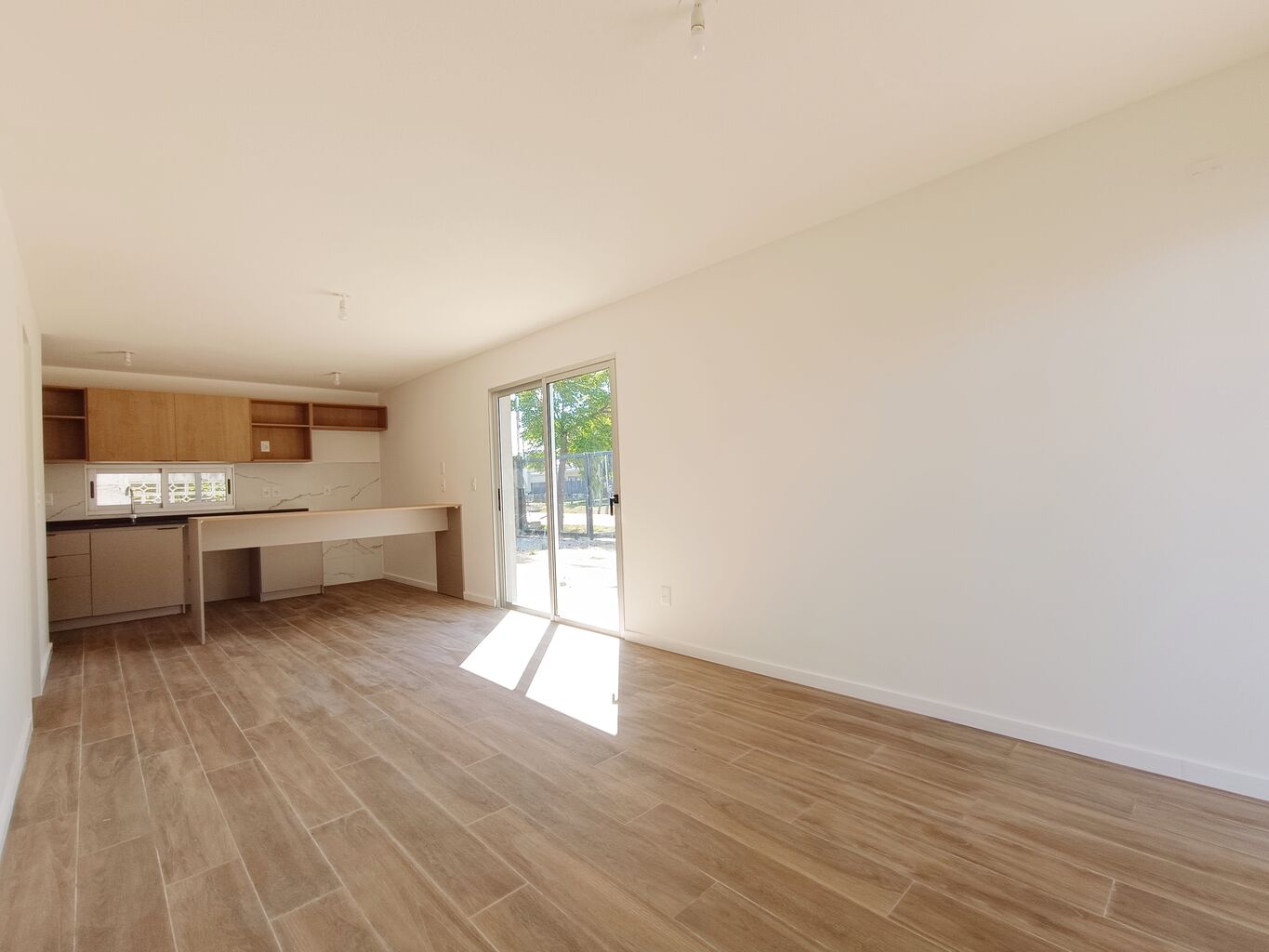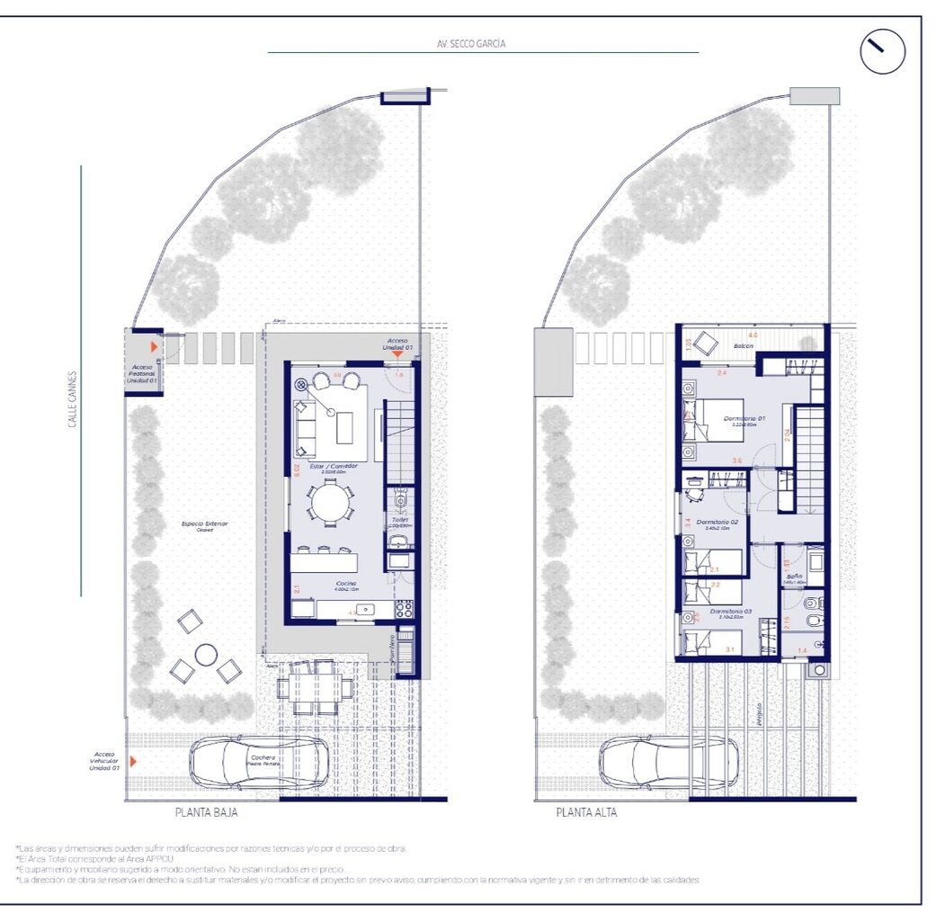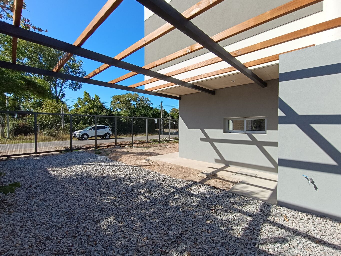 Planta Baja: living comedor con cocina integrada con mueble en melamínico MDF bajo y sobre mesada. Baño social. Ingreso vehicular y peatonal independiente, cochera para dos o mas vehículos, parrillero, pérgola