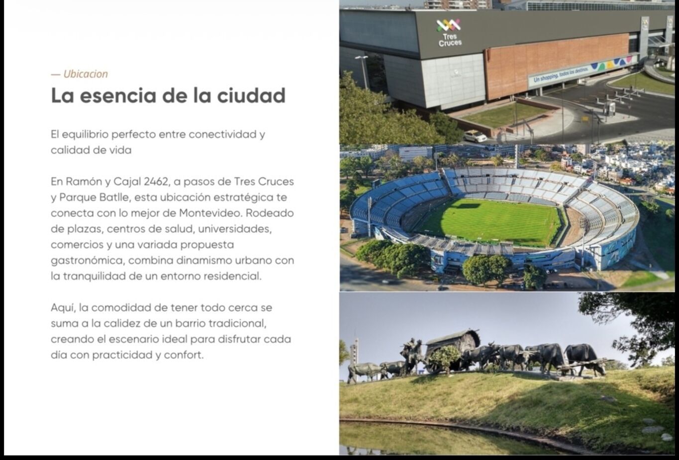 En Ramón y Cajal 2462, a pasos de Tres Cruces y Parque Batlle, esta ubicación estratégica te conecta con lo mejor de Montevideo. Rodeado de plazas, centros de salud, universidades, comercios y una variada propuesta gastronómica, combina dinamismo urbano con la tranquilidad de un entorno residencial.