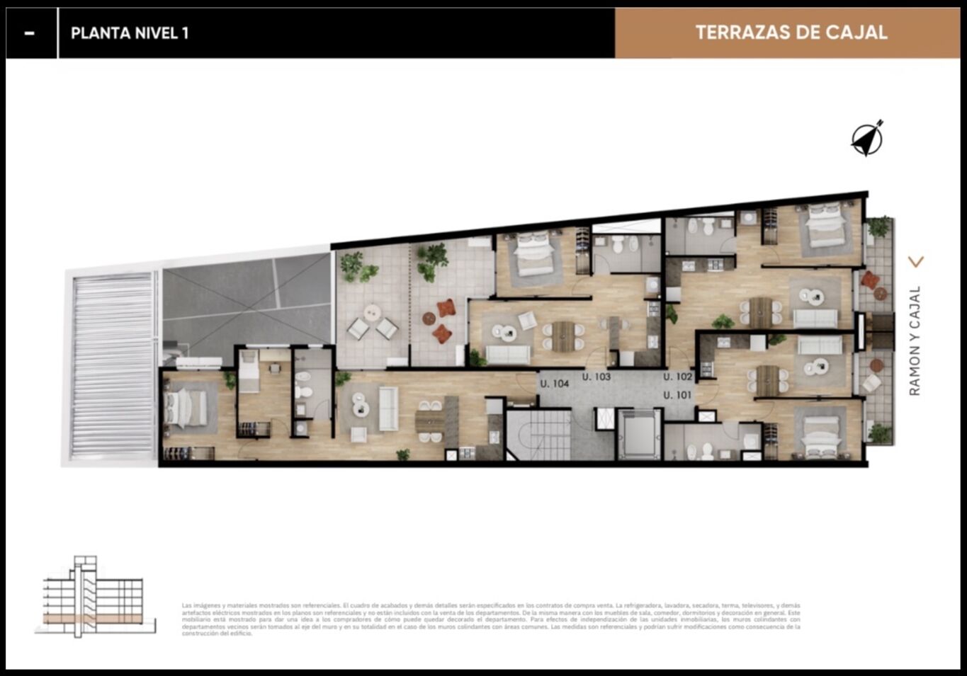 5 plantas de apartamentos, 15 unidades de1D (10 con parrillero individual),