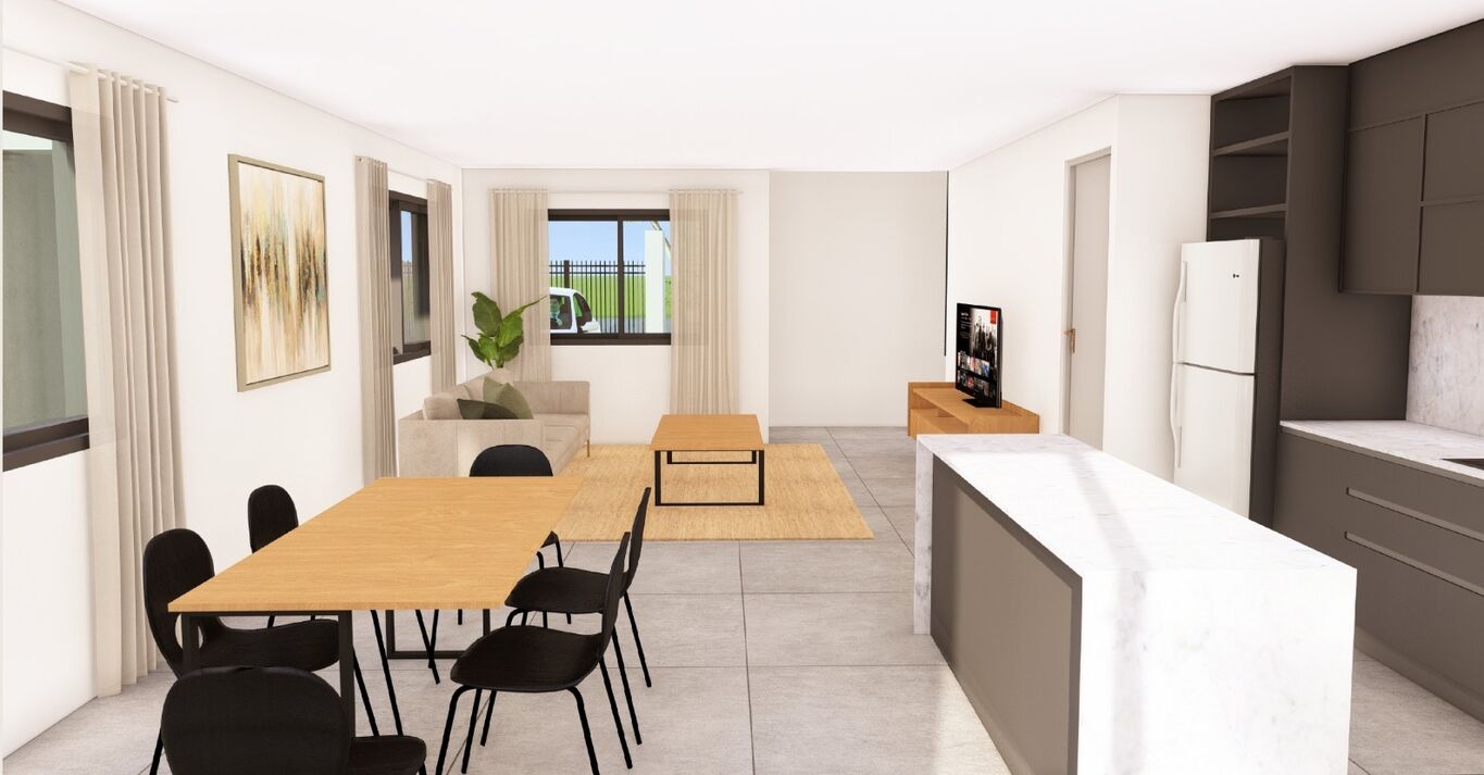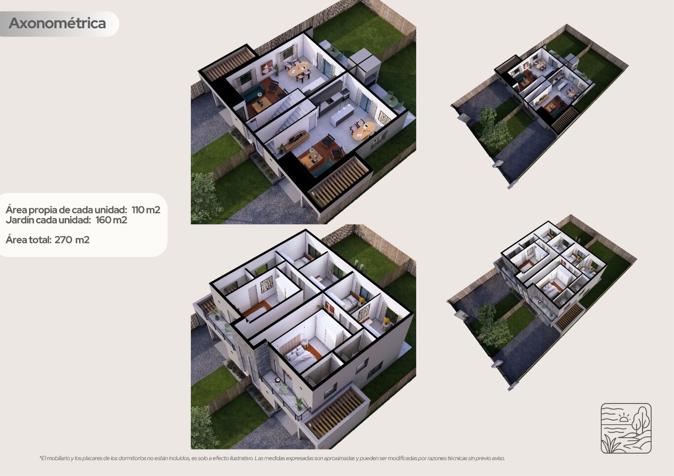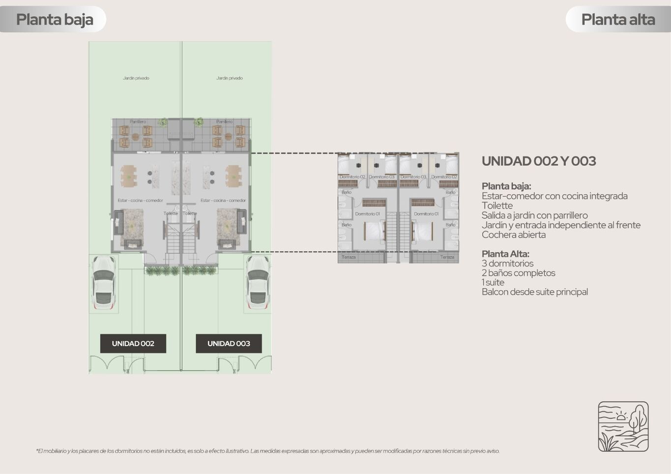 Planta baja: Estar, comedor con cocina integrada. Toilette. Salida a jardín con parrillero. Jardín y entrada independiente al frente. Cochera abierta.