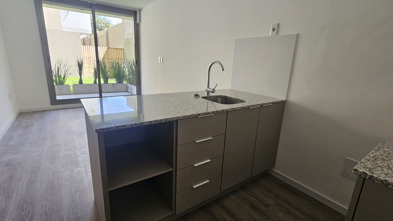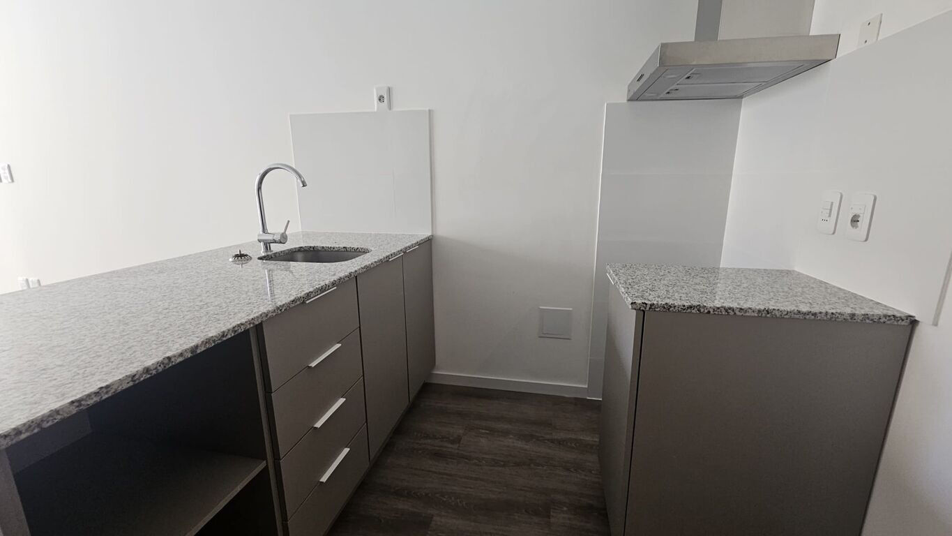 Kitchenette con mobiliario bajo mesada, bacha y barra de cocina con topes de granito y disposición para campana