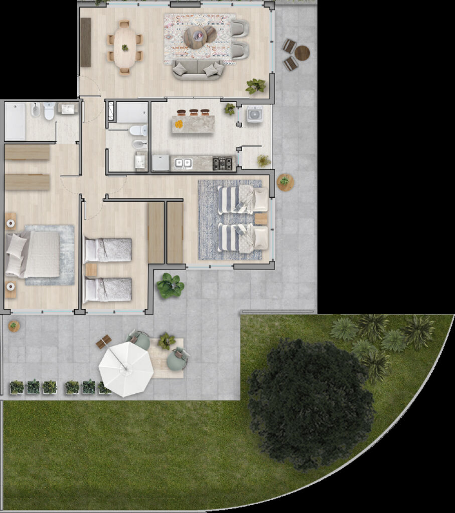 Se destaca esta unidad en planta baja, única por sus generosas dimensiones y su gran área exterior, ideal para disfrutar como jardín propio.