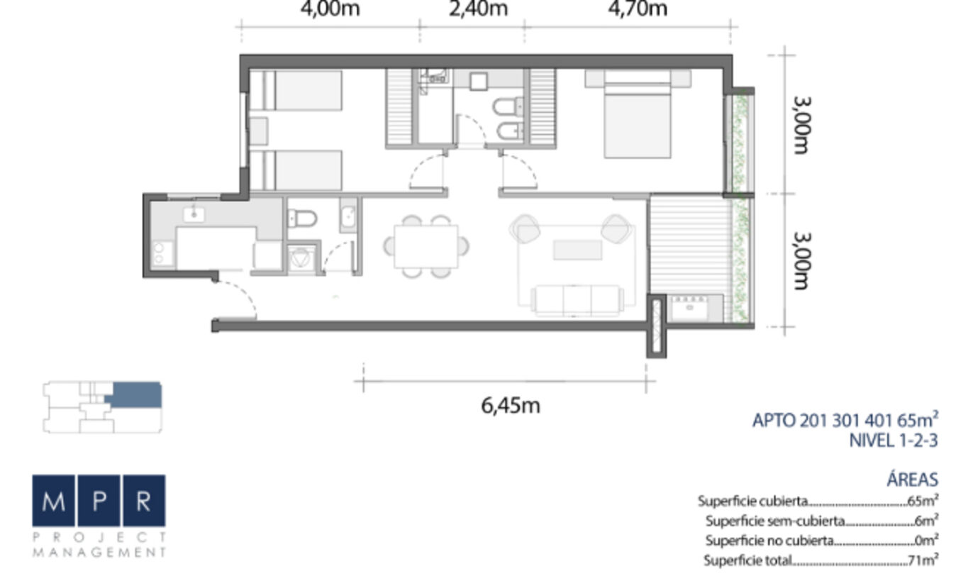 La unidad forma parte de un proyecto que se destaca por su diseño funcional, óptima distribución y terminaciones de calidad. Contará con aberturas de aluminio anodizado negro con doble vidriado hermético (DVH), pisos vinílicos símil madera y mobiliario de cocina y placares laminados.