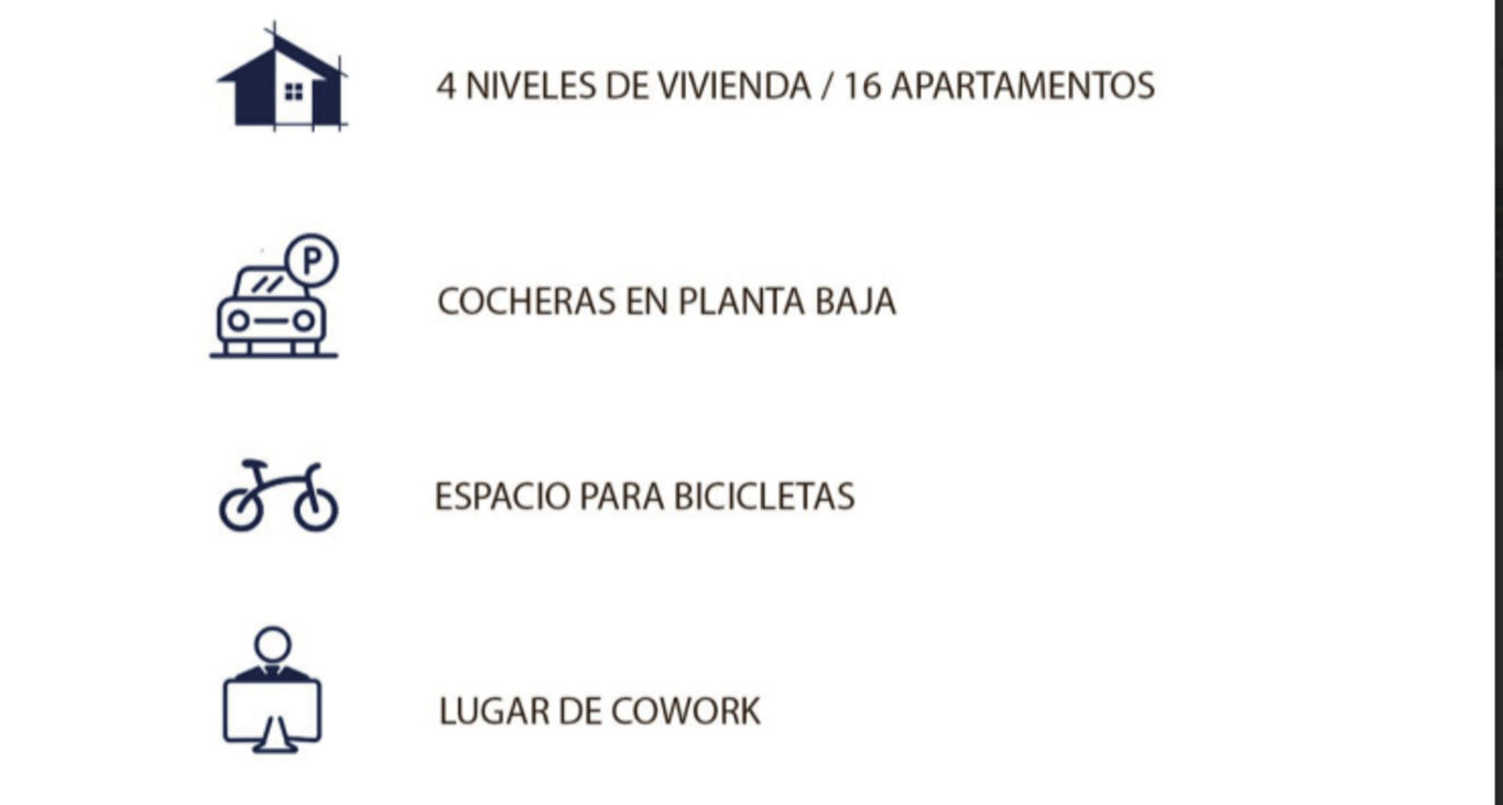 El edificio ofrece cocheras, espacio de cowork y estacionamiento para bicicletas.