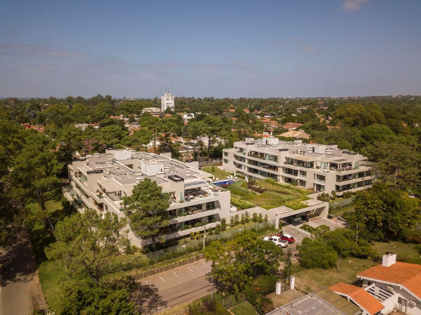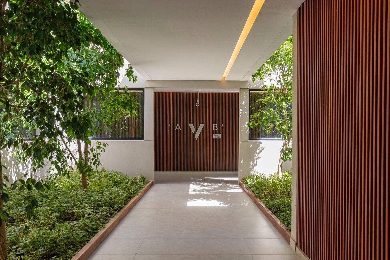 Los dos dormitorios en suit se encuentran en el ala intima de la unidad separados de la social por un pasillo al que se accede por una puerta batiente .