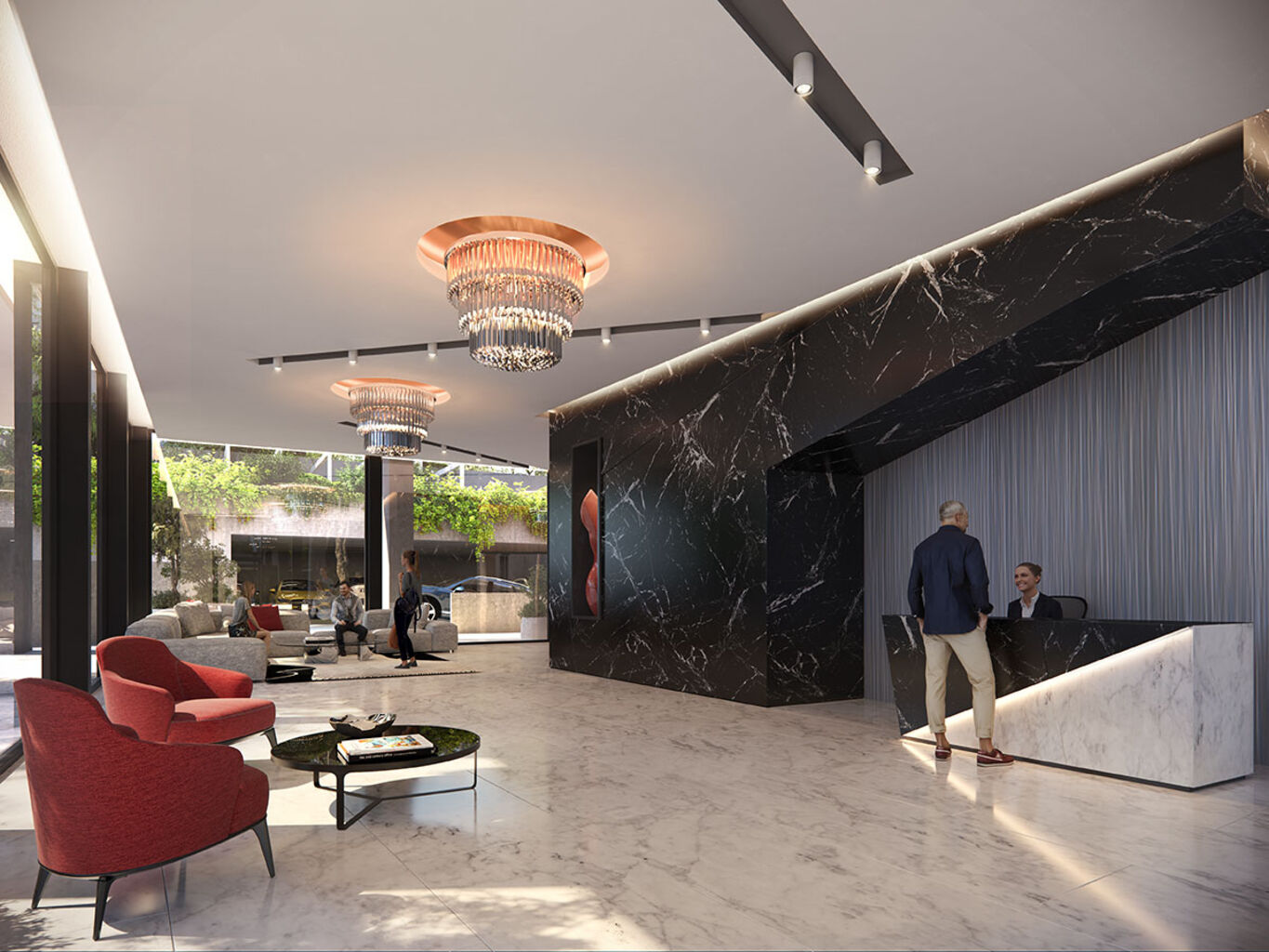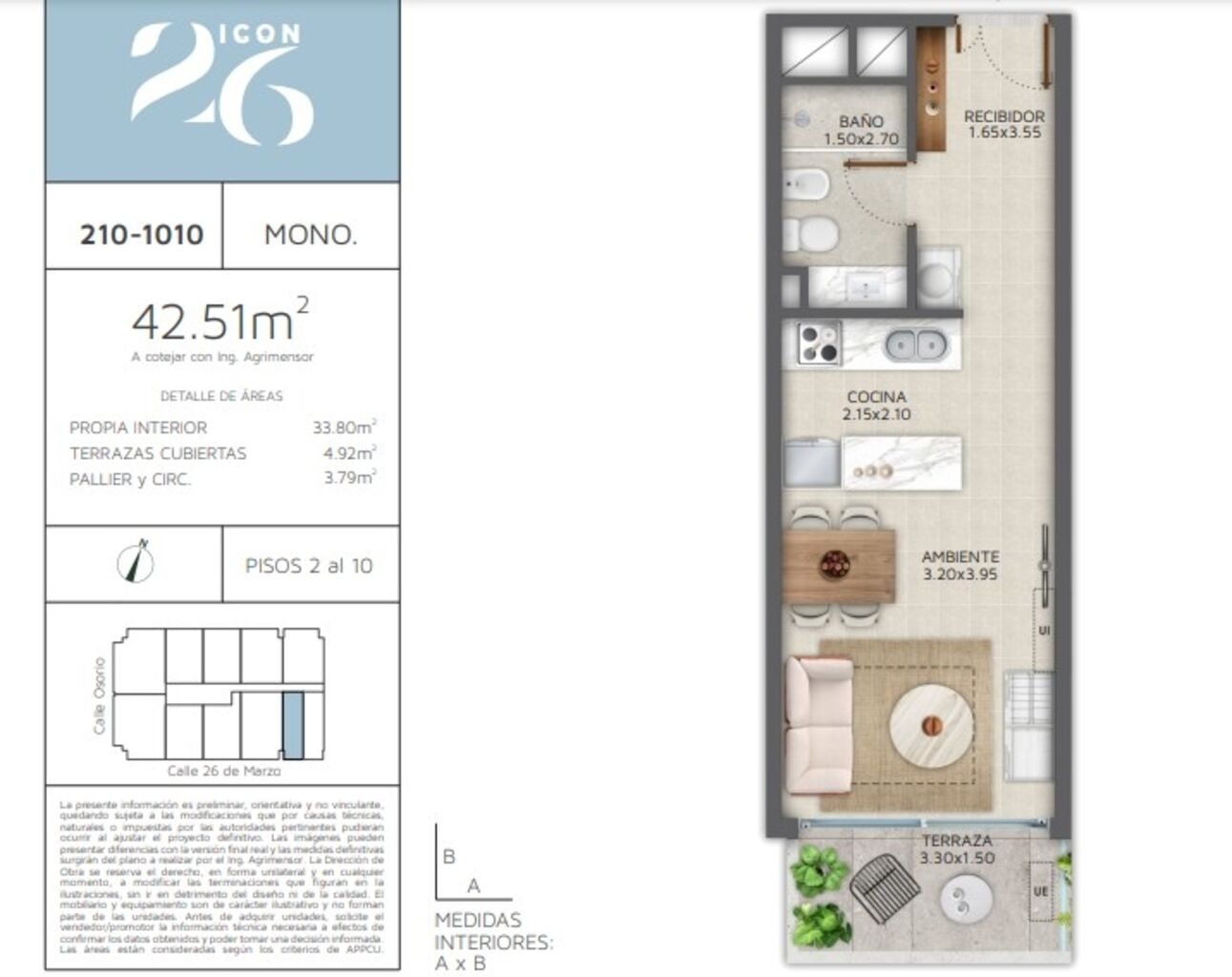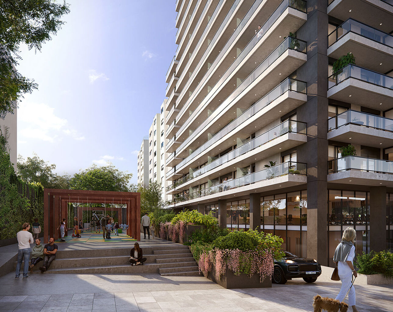 La torre de 18 pisos, se implanta con personalidad en la esquina de 26 de Marzo y Osorio, adecuándose a la dinámica de la calle con un gran basamento vidriado envuelto por una pasiva de columnas de doble altura. La base traslúcida contiene el gran lobby de acceso y un local comercial en planta baja, además de un primer piso corporativo de layout libre.Un paseo peatonal público de 17m de ancho, cuidadosamente diseñado, conecta ambas calles y separa la torre de su lindero por Osorio, mejorando su privacidad y la de sus vecinos.