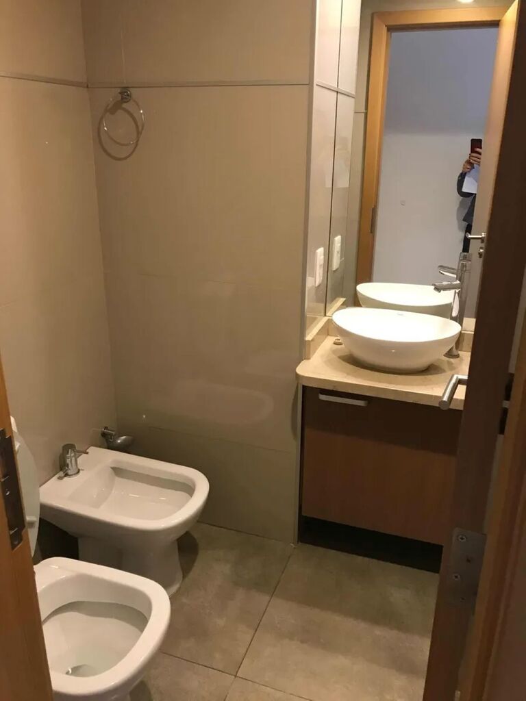 Baño con porcelanato, placar debajo de pileta.