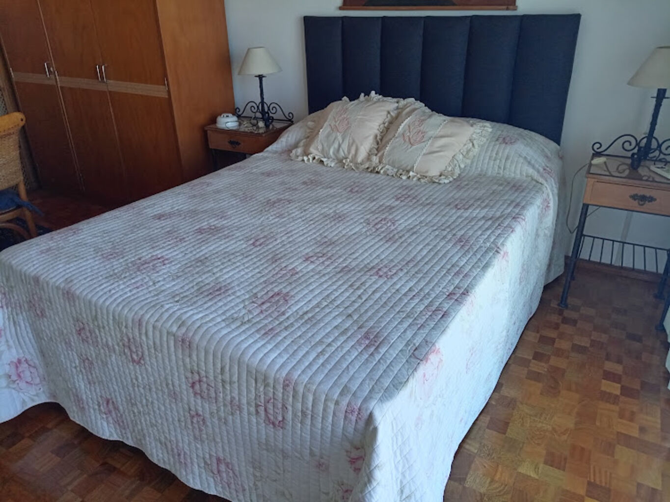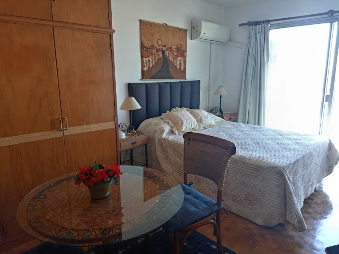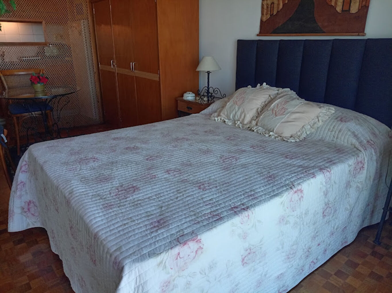 Cama de dos plazas, placard, mesa y dos sillas