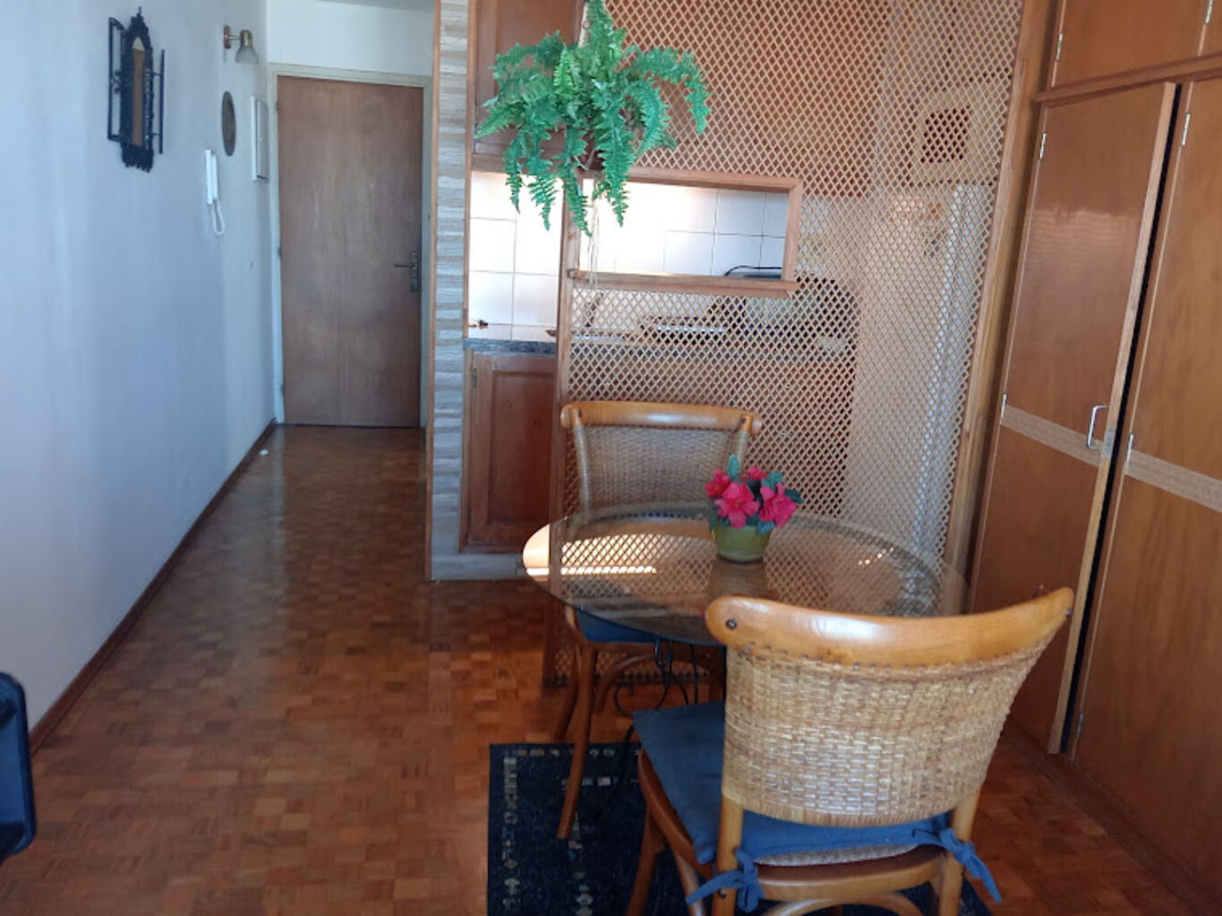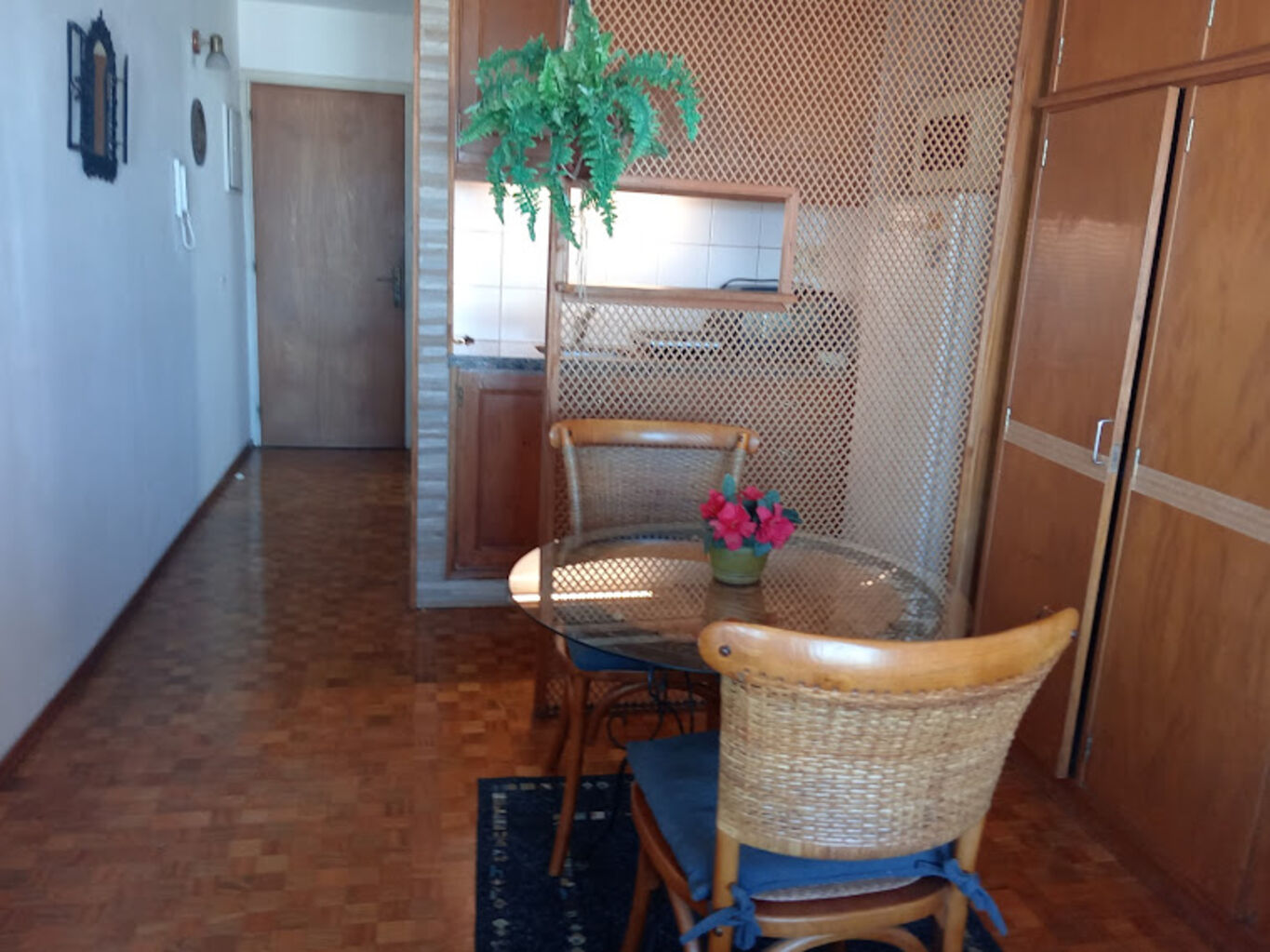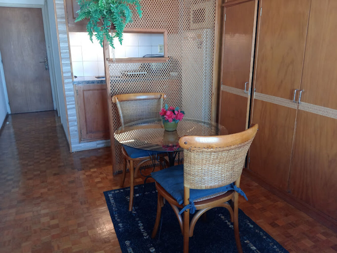 Cama de dos plazas, placard, mesa y dos sillas