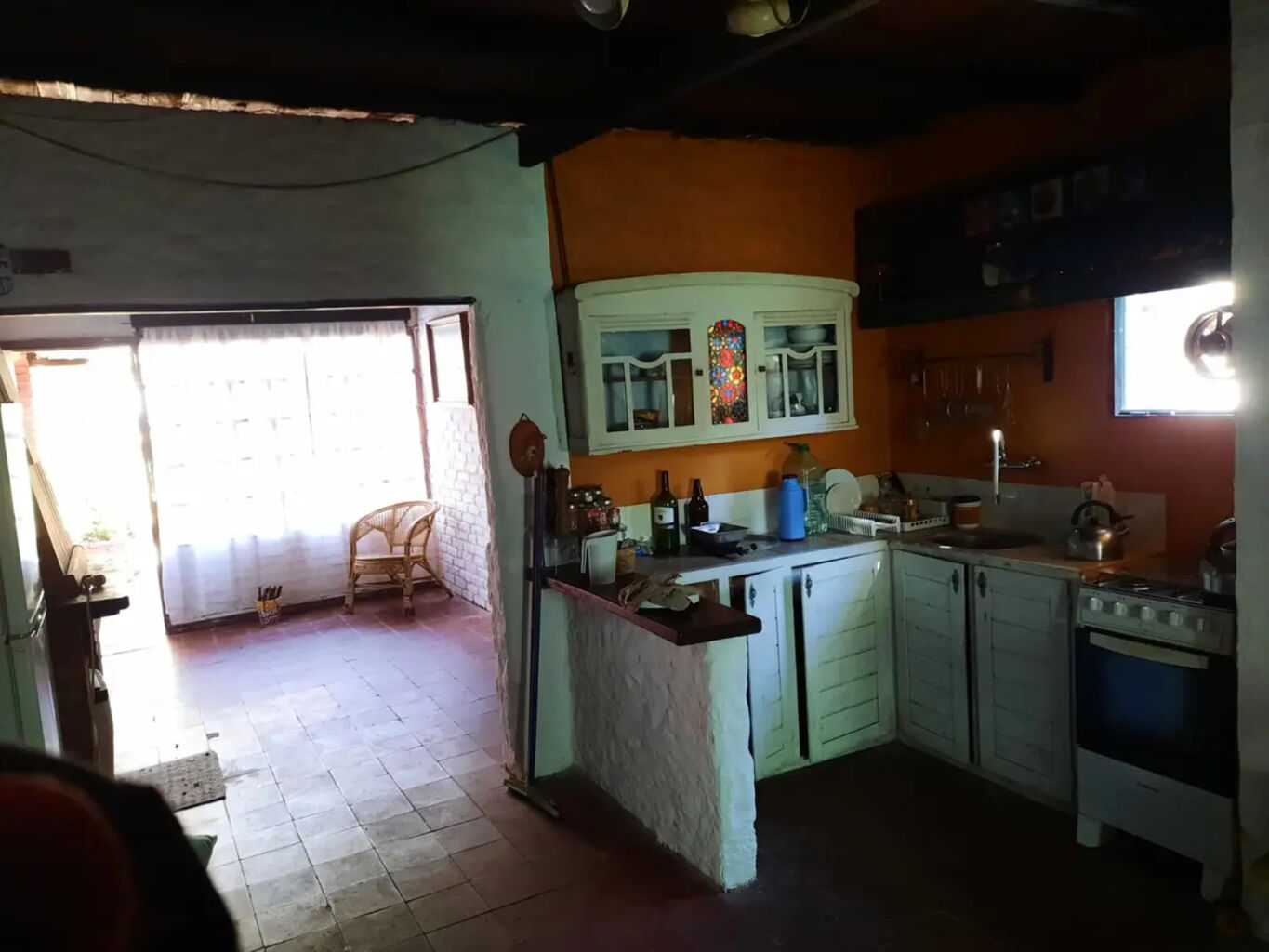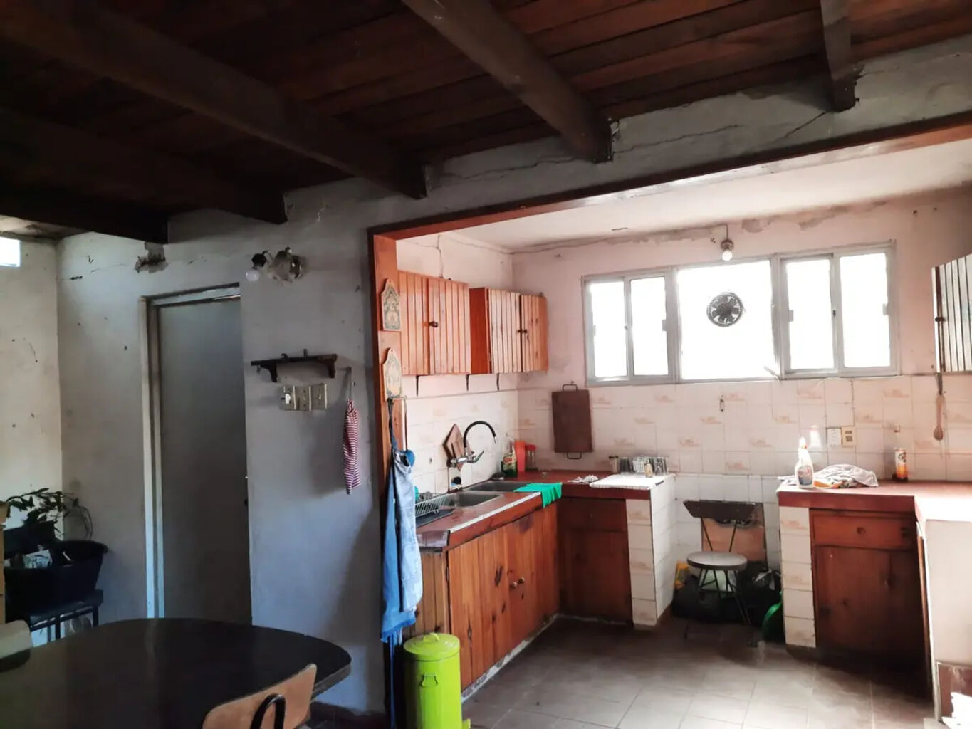 living comedor, cocina, estufa a leña,