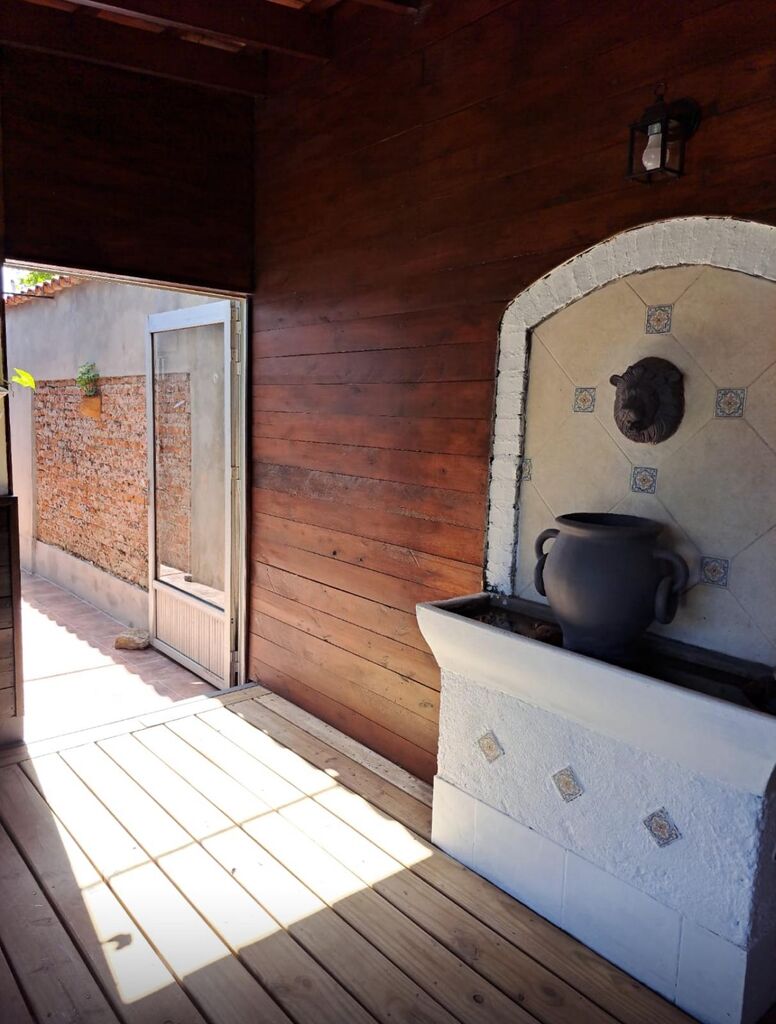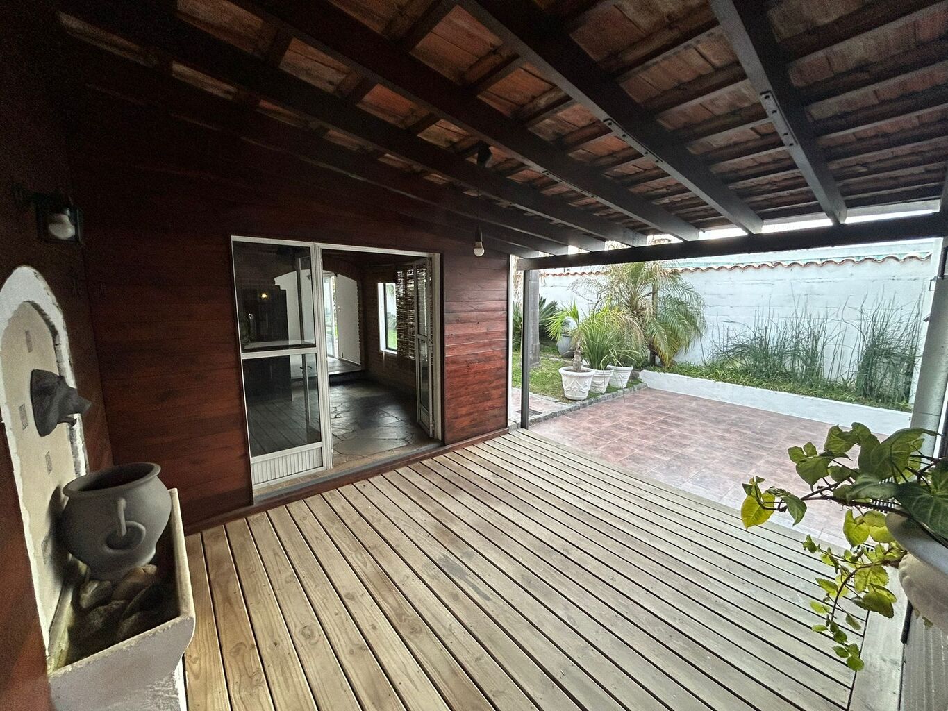 • Patio con deck y fuente de agua sobre la pared.
