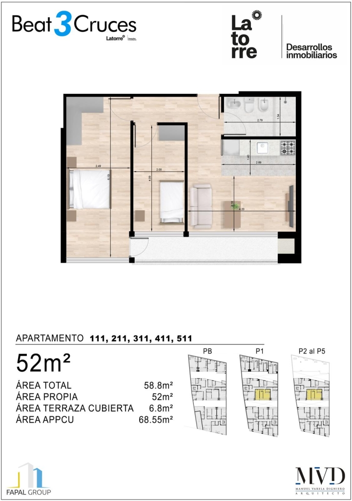 Unidad 311 de 2 dormitorios de 52 m y 7 de terrazaUnBeat 3 Cruces – Proyecto en pozo en Tres Cruces