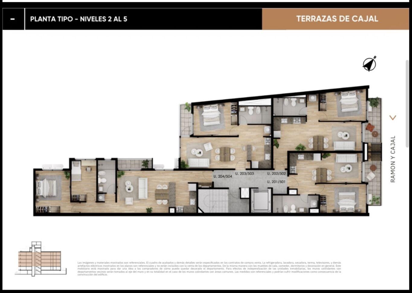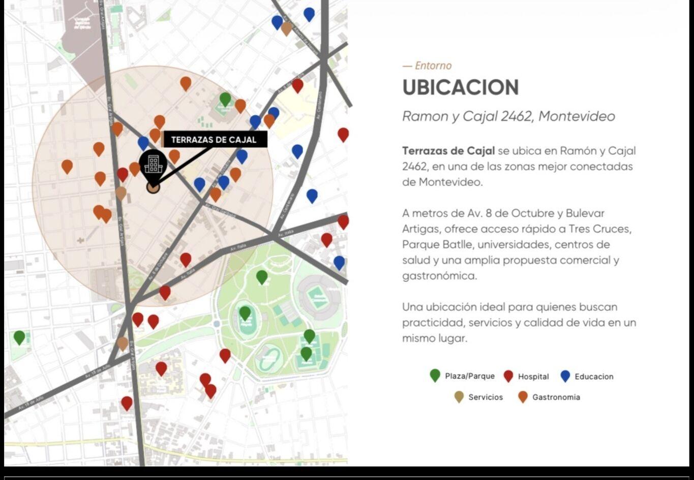 Terrazas de Cajal es un proyecto residencial único que combina diseño contemporáneo, calidad constructiva y una ubicación excepcional en Ramón y Cajal 2462, a pasos de Tres Cruces y Parque Batlle. Su entorno ofrece el equilibrio ideal entre accesibilidad, servicios y la tranquilidad de un barrio tradicional.El edificio cuenta con 5 plantas de apartamentos, con 15 unidades de 1 dormitorio (10 con parrillero exclusivo) y 5 unidades de 2 dormitorios, además de 10 cocheras individuales. En el nivel 6 se desarrollan los amenities, que incluyen barbacoa con terraza, cowork y laundry, ideales para un estilo de vida actual.